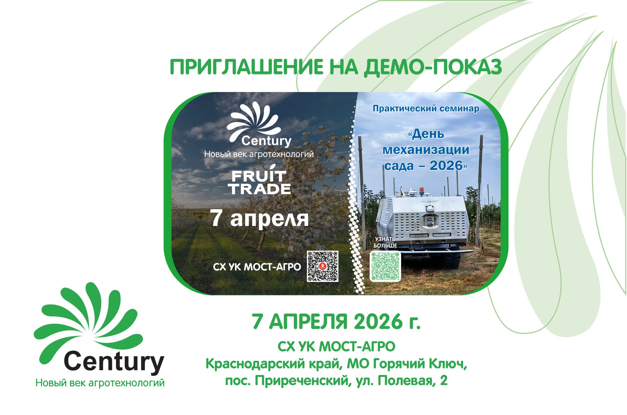 - 10:00 – 12:30 – Демонстрационный показ техники в реальных условиях сада.